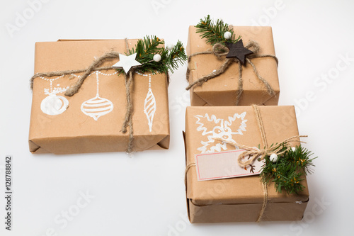 Christmas Decoration Boxes With Christmas Gifts Beautiful Packaging Gift Wrap With Pictures Handmade Stock Photo Adobe Stock