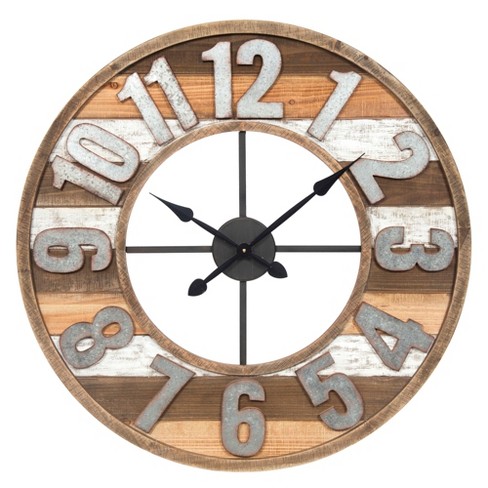 Fuzhou Wisdom Handicrafts CoLtd. This oversized wood metal 36 wall clock has a rustic finish features a round corrugated iron frame with black finish stained brown MDF clock face beige roman numeral markings black clock hands and requires 1 AA battery. Rustic Wood Wall Clock.