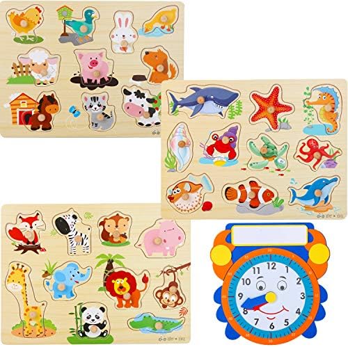 Wooden Peg Puzzles For Toddlers And Babies Pack Of 3 With Learning Clock Animal Chunky Educational