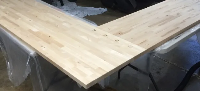 The resulting L-shaped desk is stable and durable. I used the larger table top for the vanity. This is where I learned one of my biggest lessons on this project I used 2x6s for the top of my desk but I am going to recommend using 1x6s instead to cut down on some of the weight and make the desk lighter and easier to move.